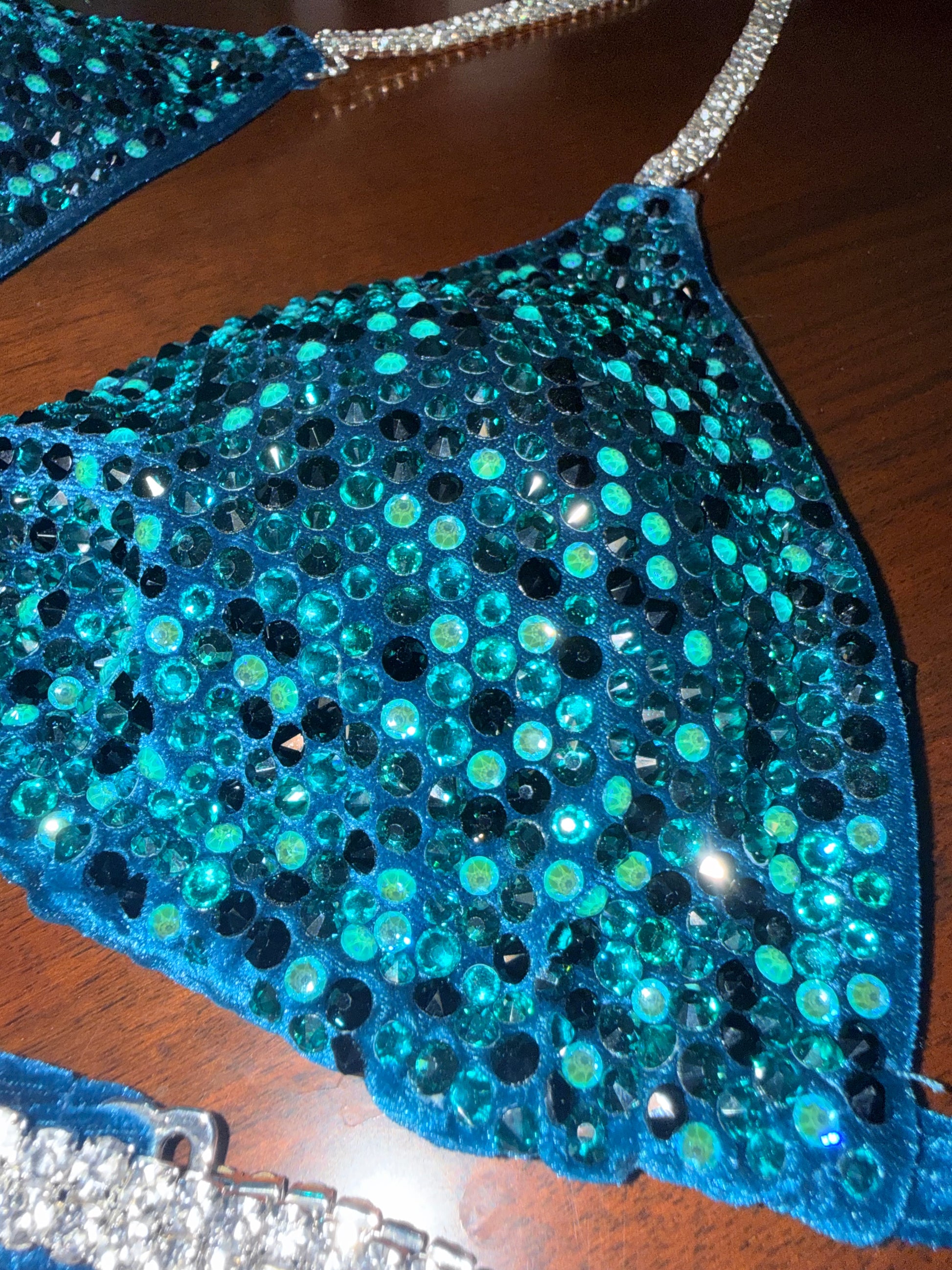Brand new, never worn on stage. IFBB Welness cut bikini in emerald green/ cobalt blue crystals made by Stacey at 67 bikinis . Paid $800 for it and never worn. Comes with protective bag.