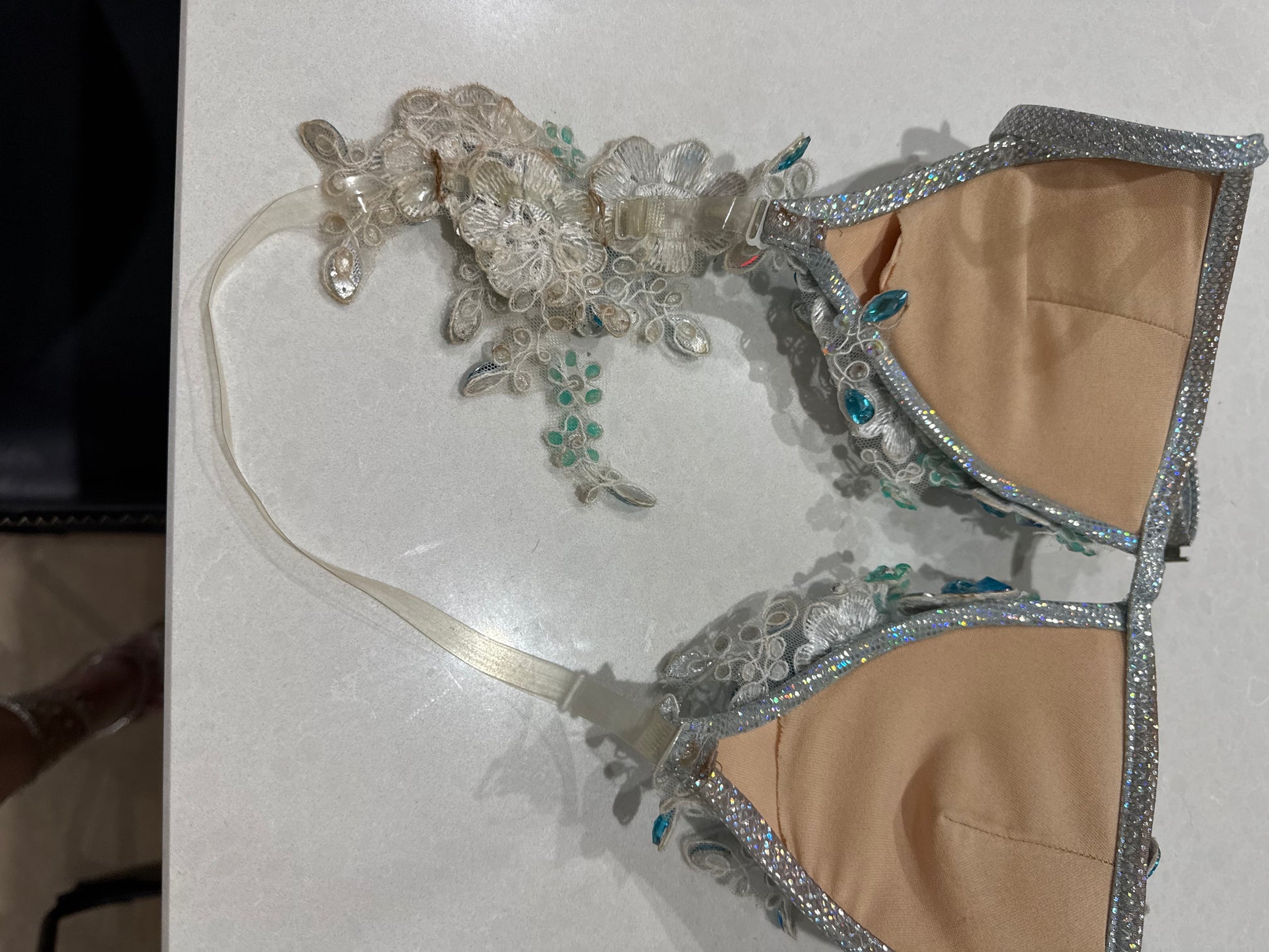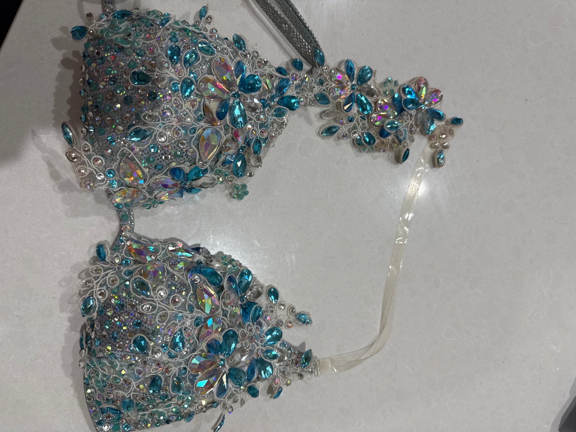 A reminder these bikinis are used, so there may already be some minor missing gems on the piece when you receive it. If there are further gems that fall off we ask that you place them back in the box if possible.