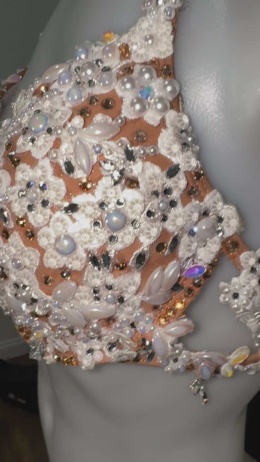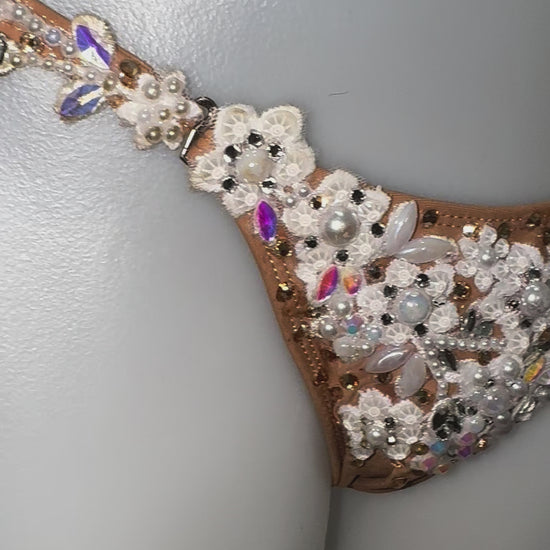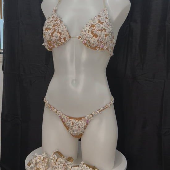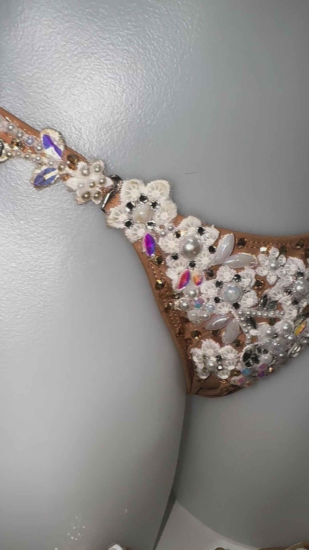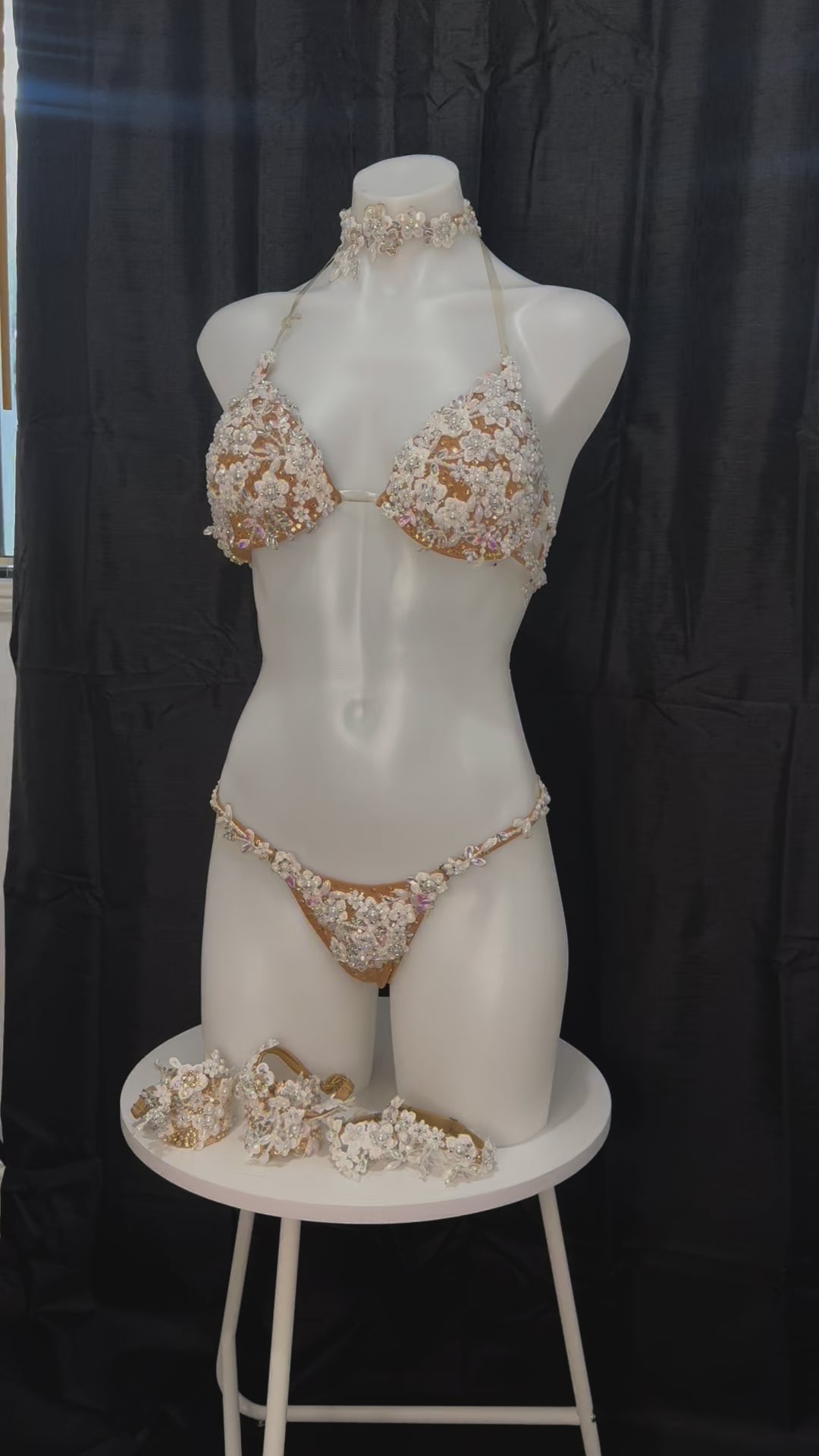 This bikini was designed to show the illusion of the white embellishments to POP on top of the skin colours base. All accessories shown are also included.